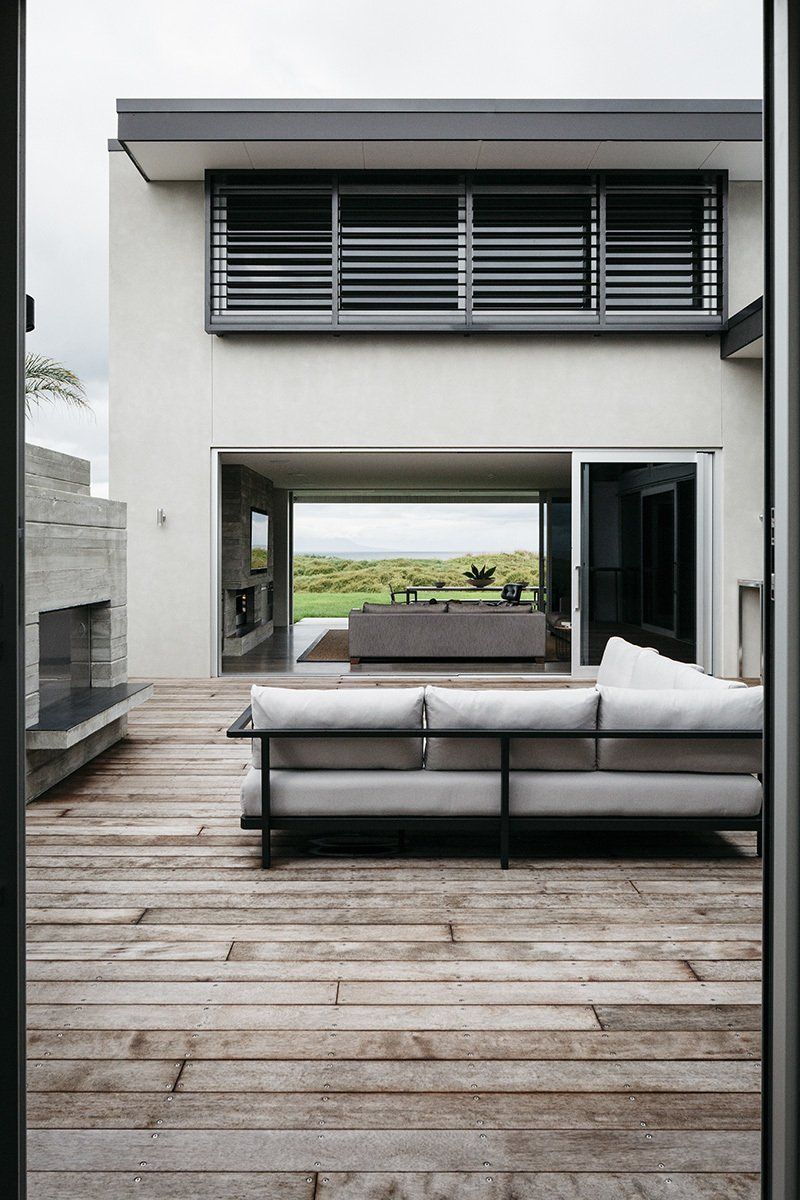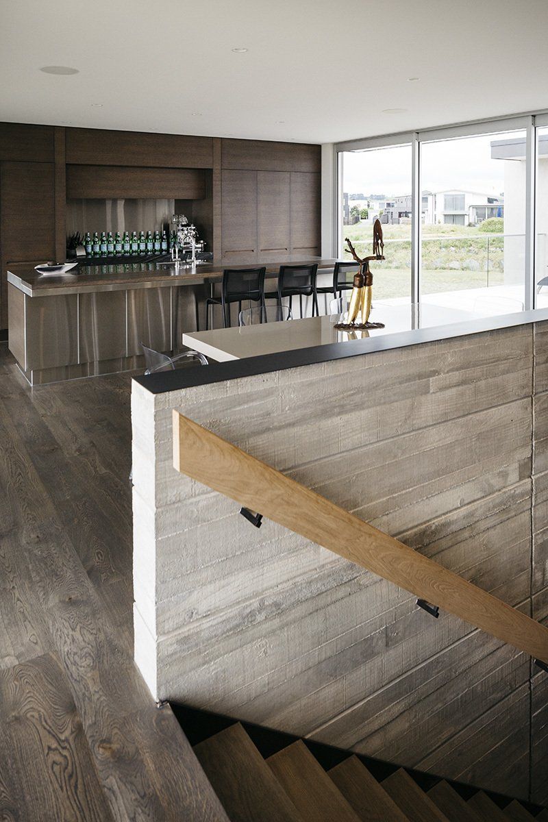 Features include: unique internal and external in-situ concrete walls, built-in custom cabinetry, striking under-lit staircase, private and sheltered central deck with cosy outdoor fireplace, huge floor-to-ceiling stacker sliders which maximise the impressive beachfront aspect and seamlessly open the indoors to the outdoors.