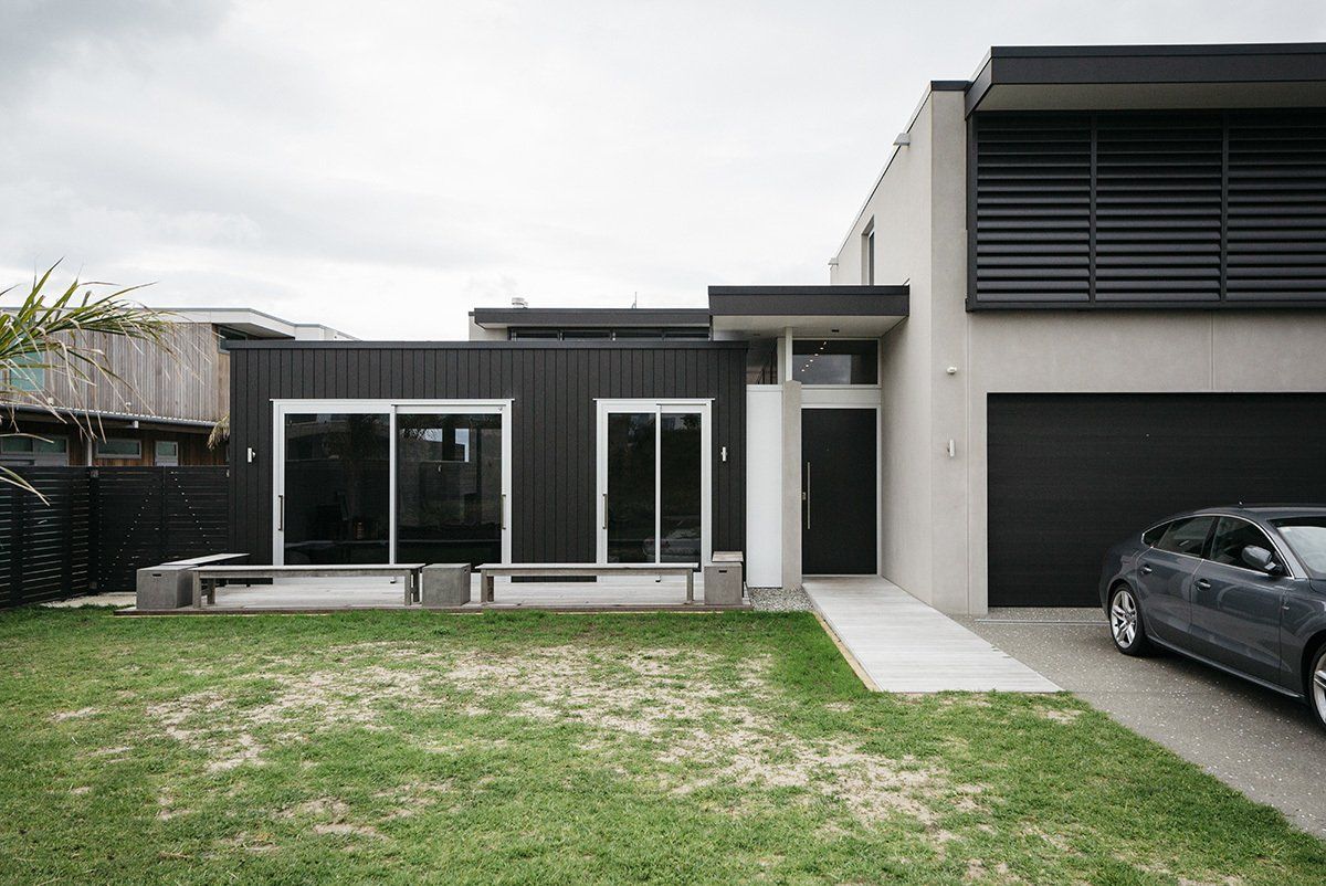 Hulena Architects designed the solid concrete masonry sto plaster system house to be built in stages providing flexible living configurations for the owners, their family and guests.