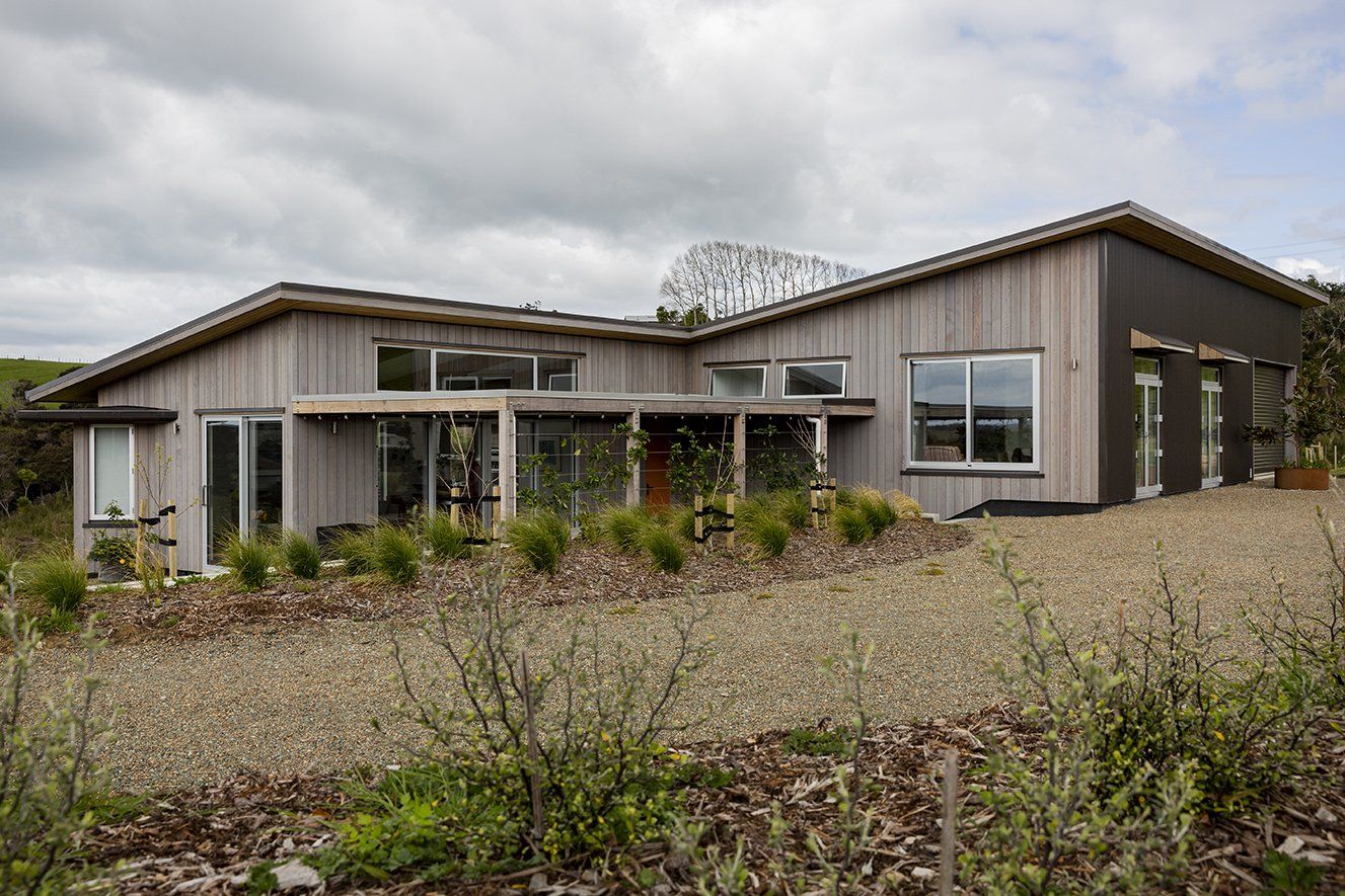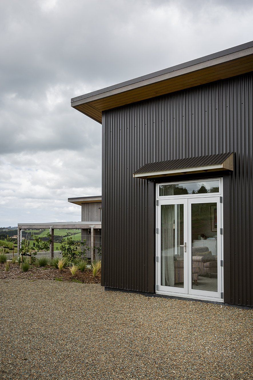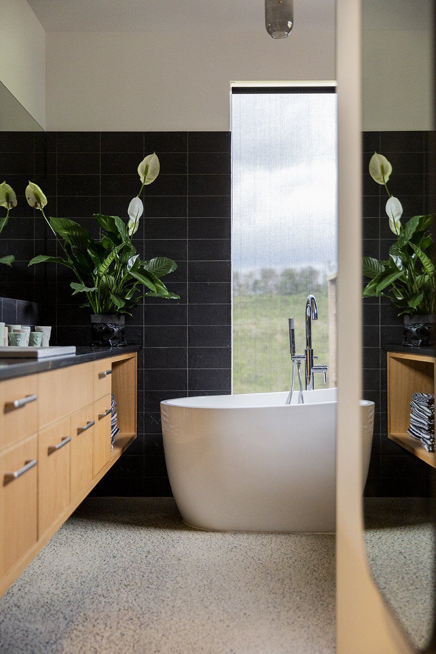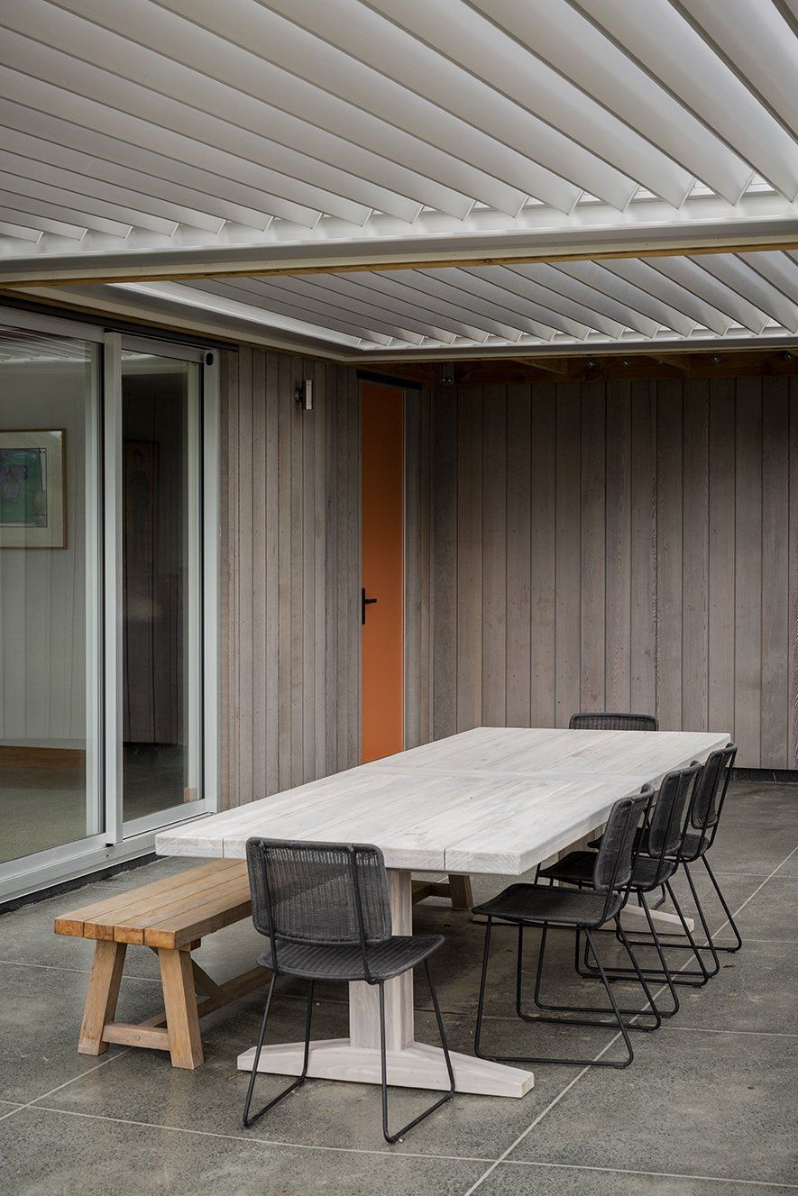 The use of black Zincalume combined with grey-washed timber cladding on the exterior, and a cleverly landscaped front patio complete with louvre roof, offers a smart casual welcome.