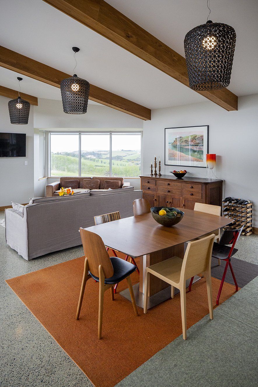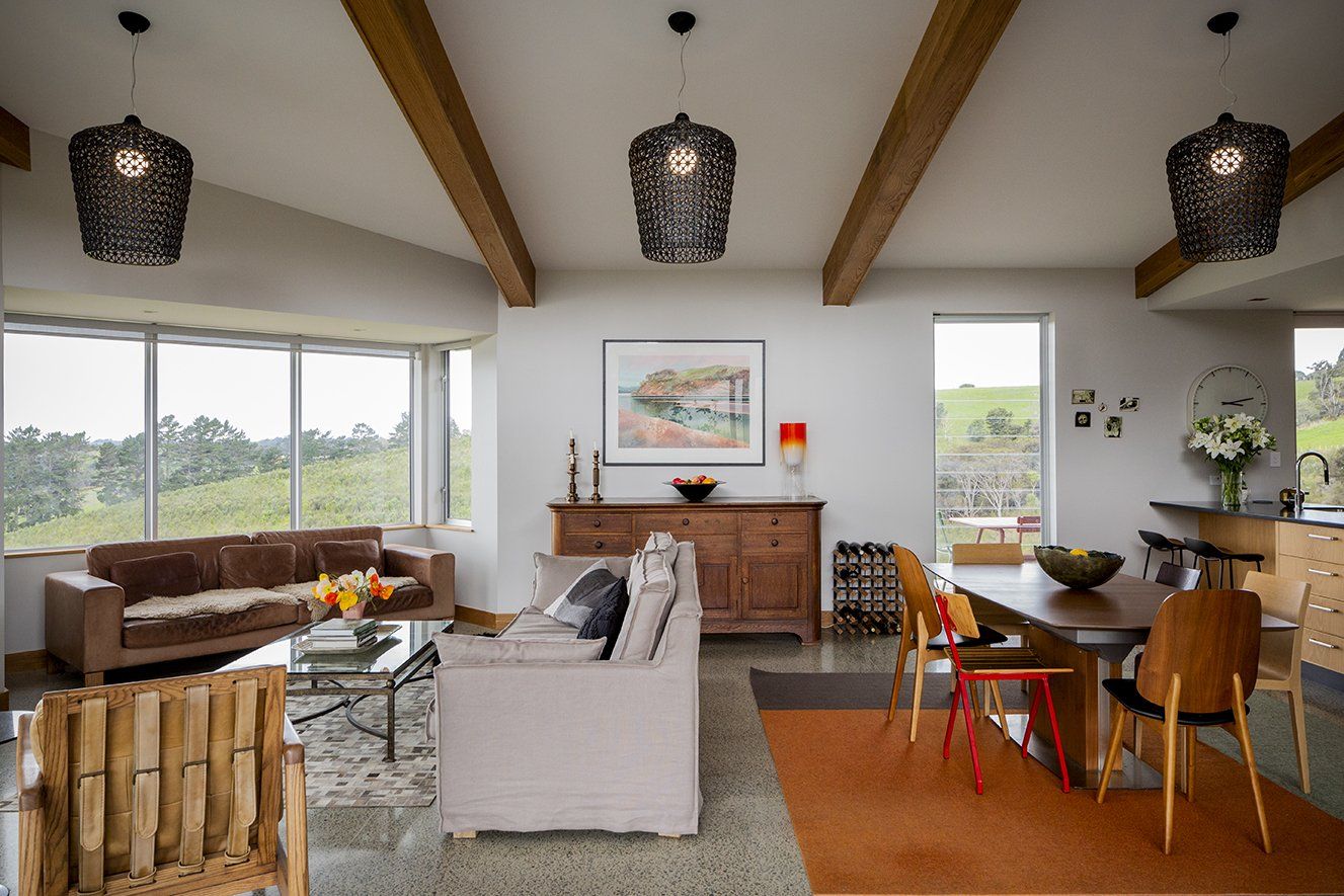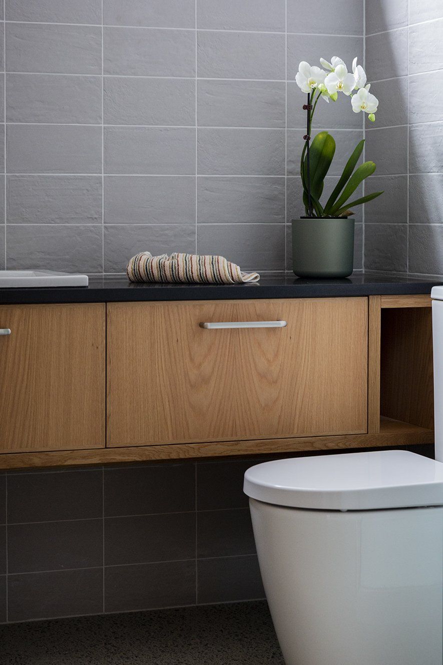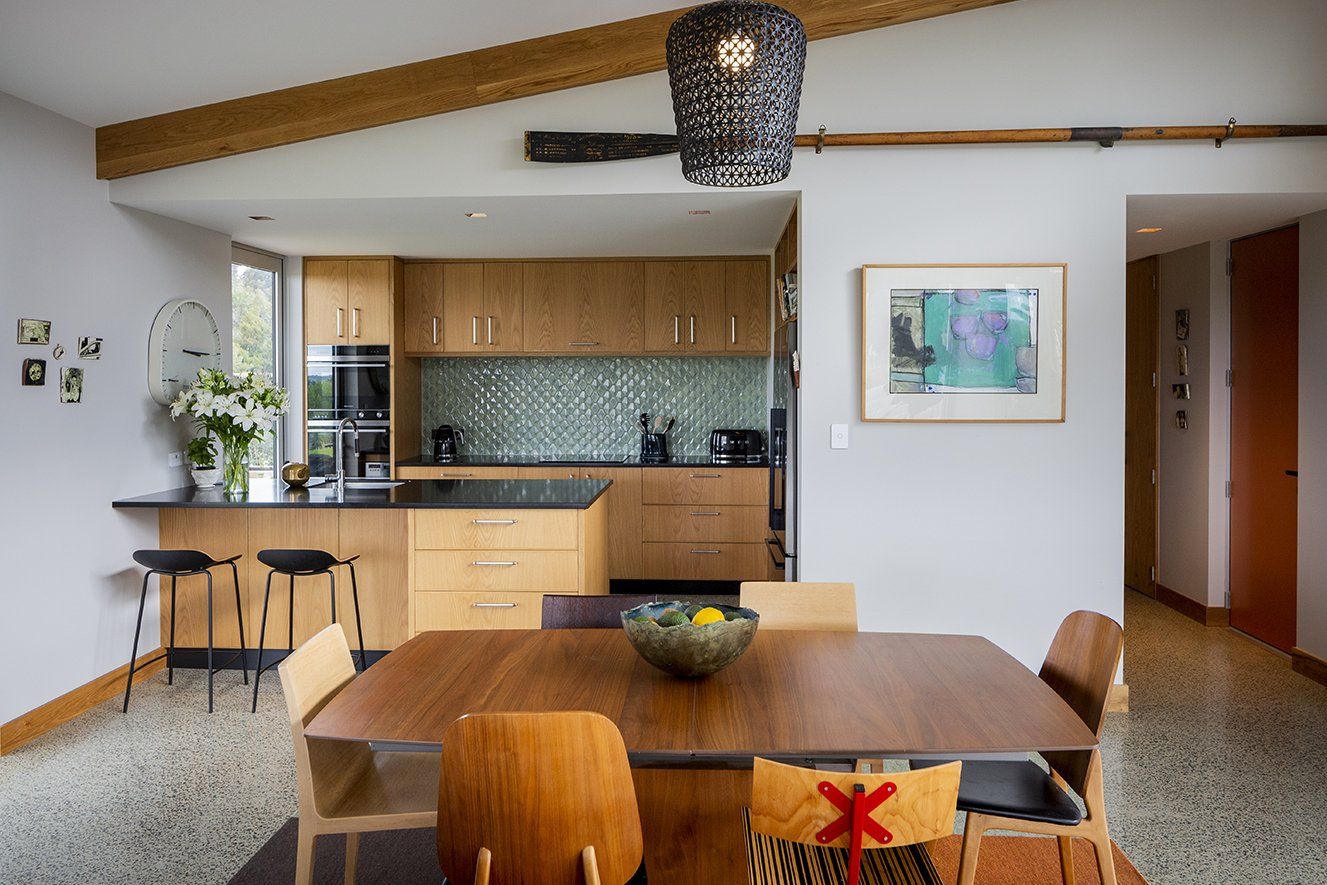 The use of black Zincalume combined with grey-washed timber cladding on the exterior, and a cleverly landscaped front patio complete with louvre roof, offers a smart casual welcome.
