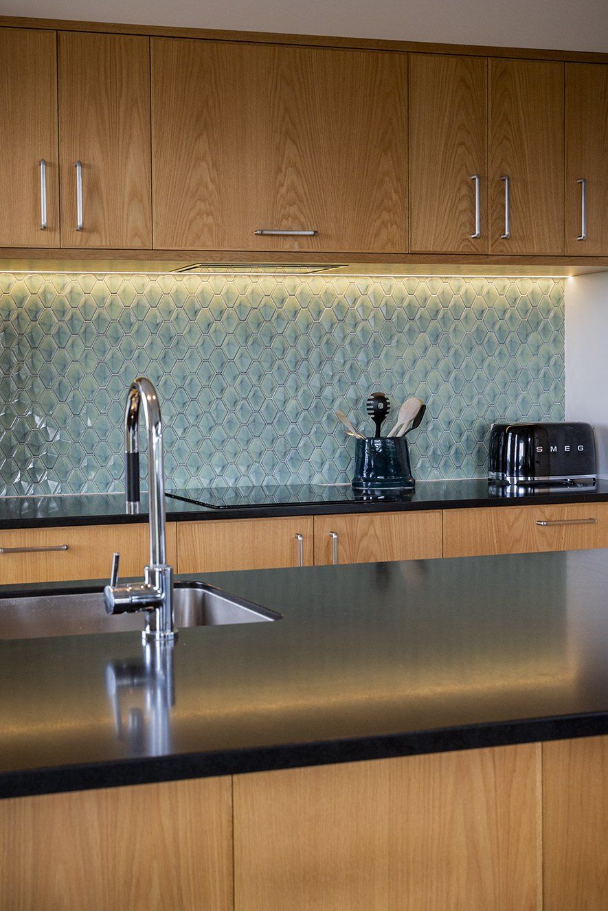 Inside the playfulness continues with the angular roof lines, creative lighting, geometric and textural tiling, oversized doors and windows...